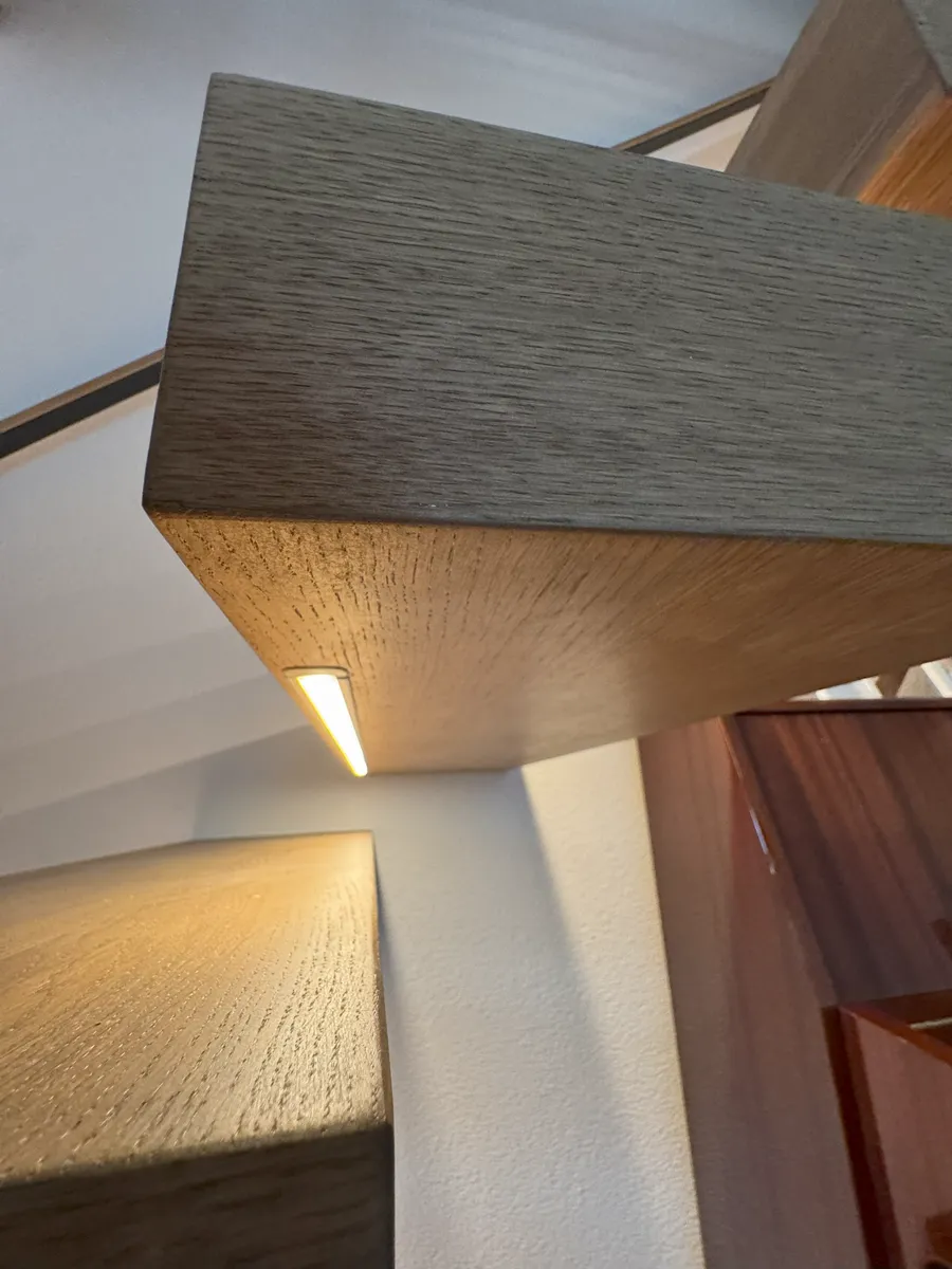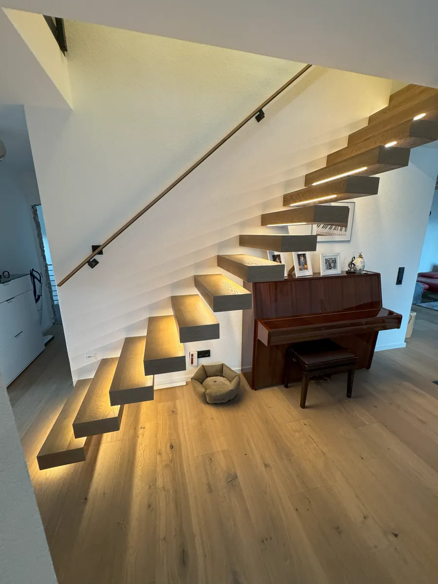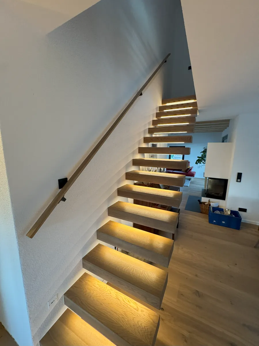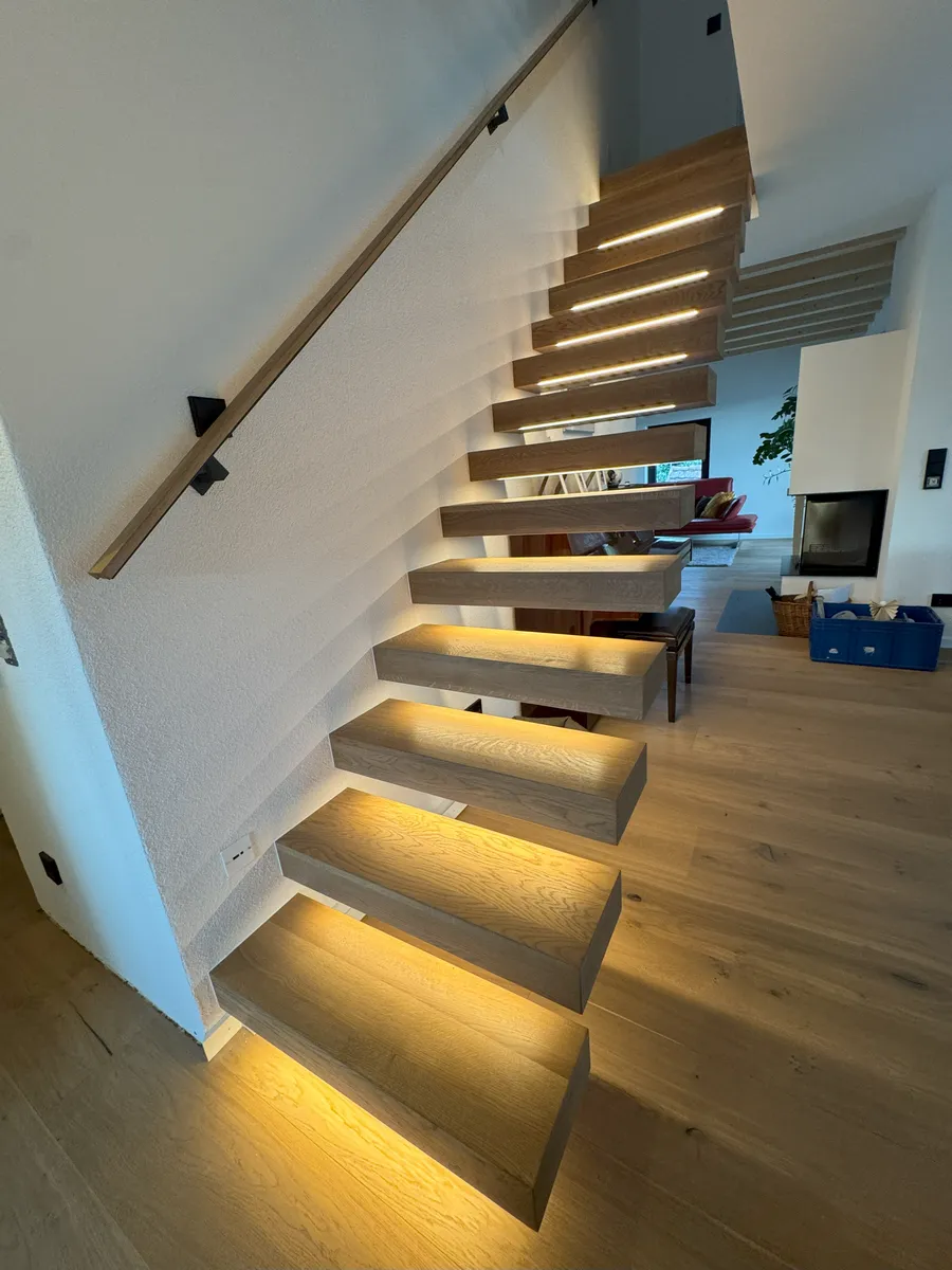 Der Kunde entschied sich für den Verzicht auf ein Geländer, sodass nur ein elegantes Holzgeländer gefertigt wurde, das farblich perfekt auf die Stufen abgestimmt war. Die Stufen wurden mit einem Hanffarbton beizt und anschließend dreifach lackiert, um Haltbarkeit und Abriebfestigkeit zu gewährleisten. Die Stufen haben eine Breite von 90 cm und wurden mit integrierter LED-Beleuchtung ausgestattet, die das moderne Design unterstreicht und die Sicherheit der Nutzung erhöht.